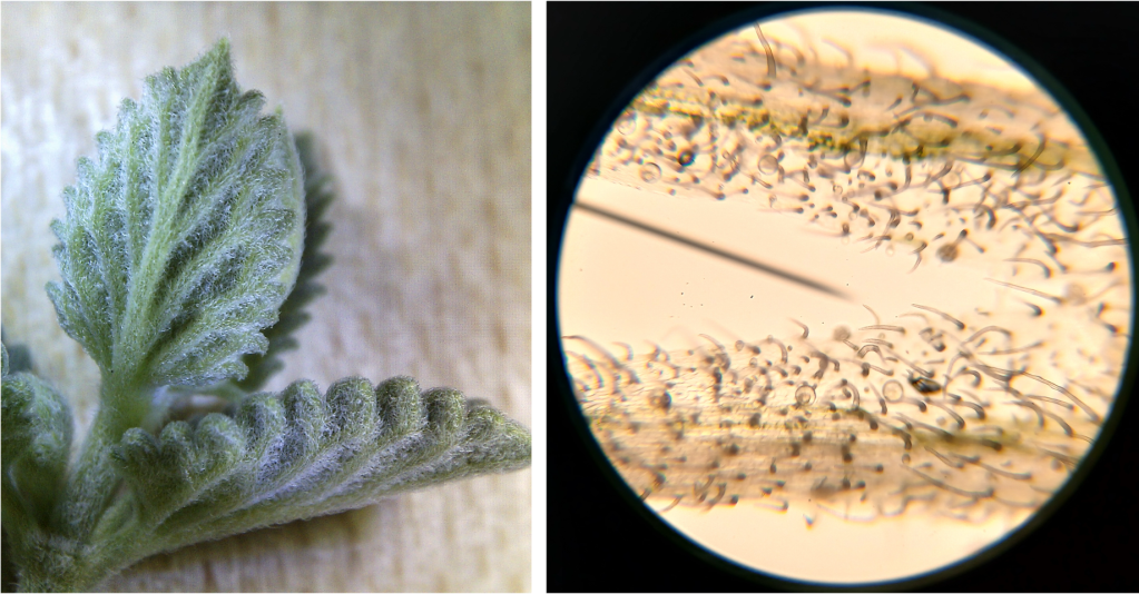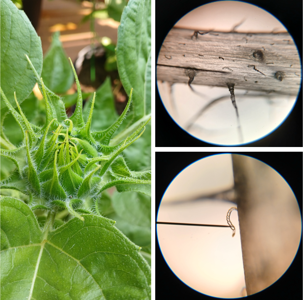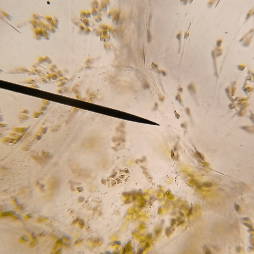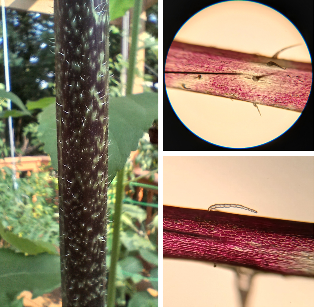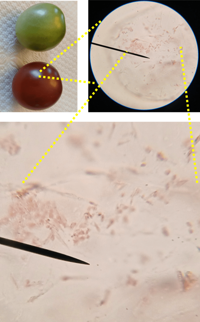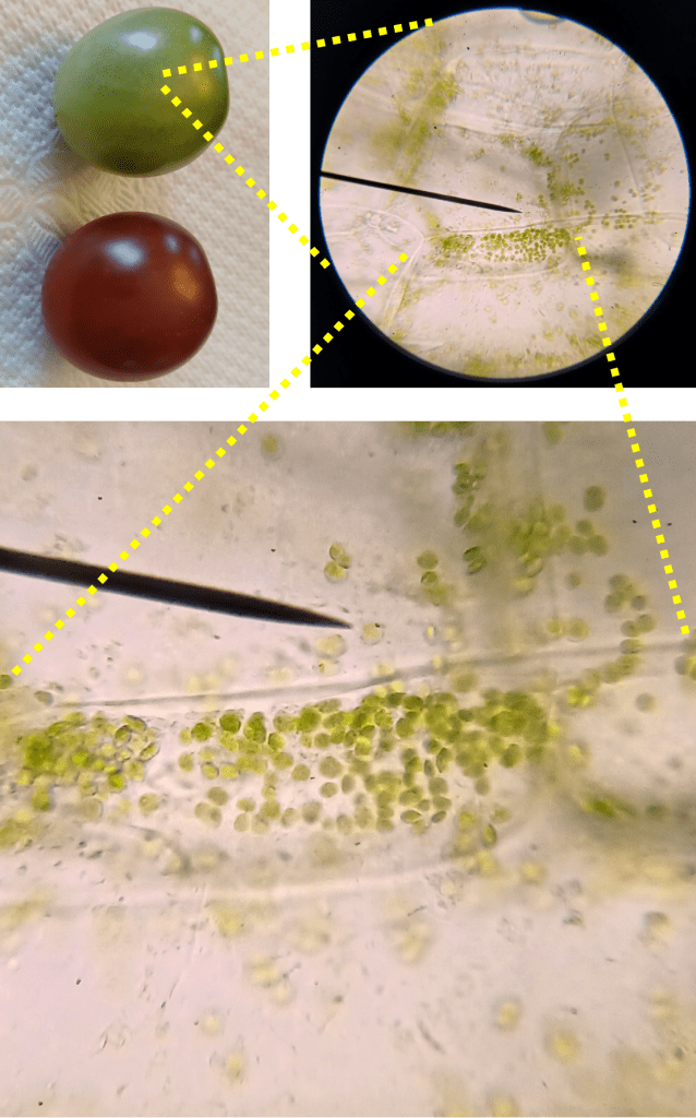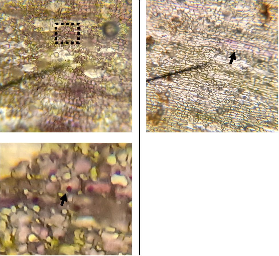 If we cut into a leaf and examine some of the green tissue, we can see that there is a layer of photosynthetic cells which are by traversed by a network of vascular tissue (Figure 4). Taking a closer look at the photosynthetic cells, we can see that there are abundant chloroplasts, which give them their green color (Figure 4 bottom left). If we look more closely at the vascular tissue, we can see intricate reticulations which are characteristic of xylem, which transports water (Figure 4 bottom right). This is all pretty textbook plant stuff, nothing unusual to see here.