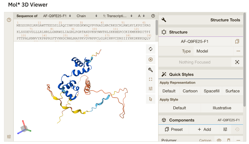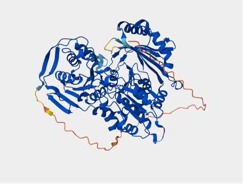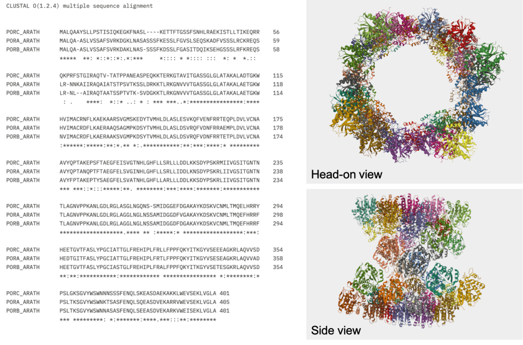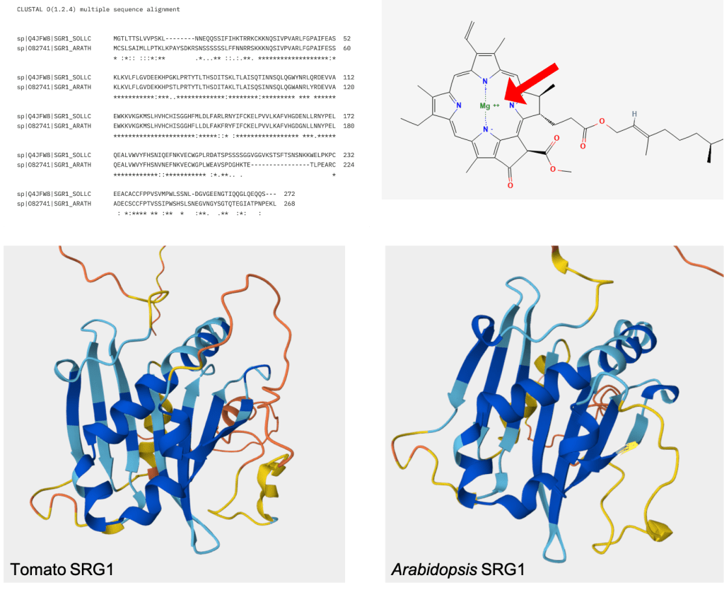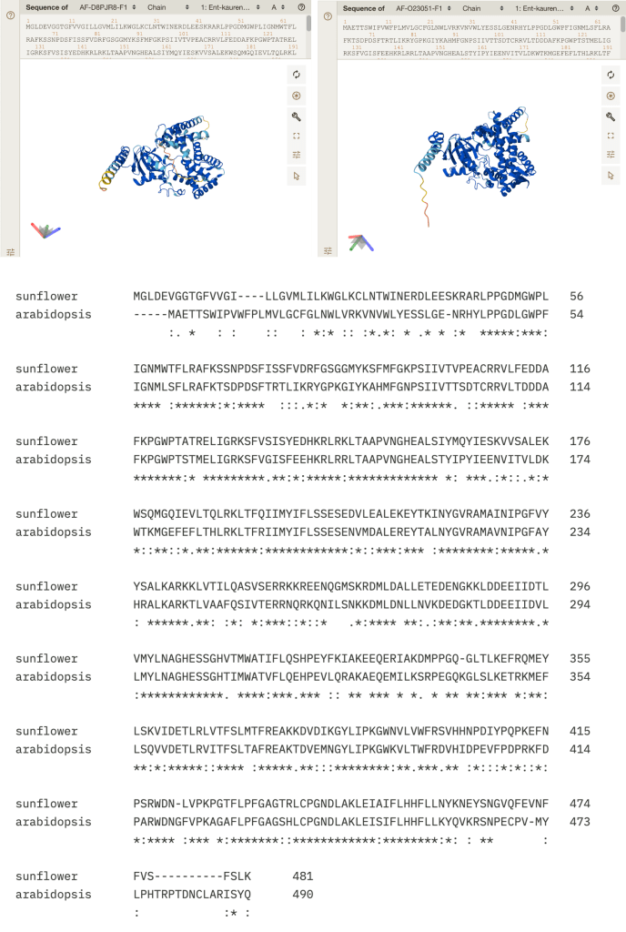 Figure 7. Left: A portion of the Blastn alignment of the putative UVH6 sequence from L. karasmontana (top) and the UVH6 sequence from Arabidopsis (bottom). (https://blast.ncbi.nlm.nih.gov/Blast.cgi). Right: Alphafold predicted structure of Arabidopsis UVH6 protein, because everyone likes pretty pictures (https://alphafold.ebi.ac.uk/entry/AF-Q8W4M7-F1).