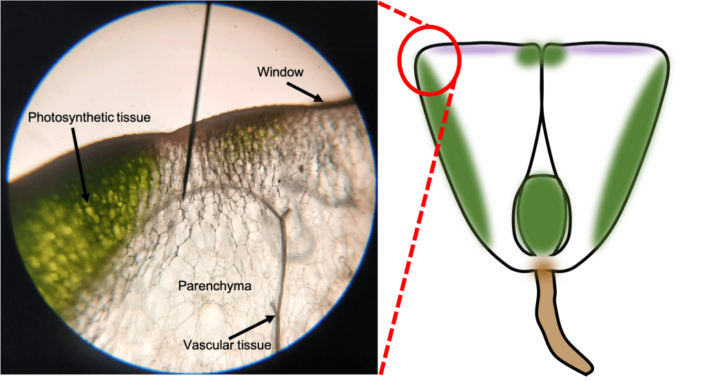Figure 5. Transverse section of a lithops leaf, showing several different parts: photosynthetic tissue, window, and parenchyma tissue.